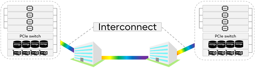 リソース間、チップ間の接続、処理を、電気ではなく光によって行います。高速性、電力効率に優れた光技術を活用することで、電気的な接続を行う従来コンピューティングと比して、消費電力を削減するとともに、低遅延や処理性能向上を実現します。