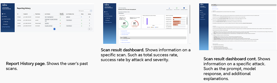 オマー: 富士通のLLM脆弱性スキャナーとガードレールの特徴は、3つのAIエージェントを活用している点です。現在、様々なスキャナーやガードレールが多くの企業で導入されていますが、一般的なものとは異なり、私たちのLLM脆弱性スキャナーは攻撃AIエージェントとテストAIエージェントで構成され、業界トップクラスの7,000以上の悪意のあるプロンプトと25種類の攻撃タイプを網羅することで、様々な攻撃シナリオをテストできます。また、LLMガードレールは不適切な応答を防止し、生成AIシステムの安全かつ確実な機能を保証するための防御AIエージェントで構成されています。さらに、LLM脆弱性スキャナーとLLMガードレールは単独でも連携しても動作可能です。例えば、LLM脆弱性スキャナーが脆弱性を検出した場合、その情報を悪意のある攻撃プロンプトをブロックするLLMガードレールにと組み合わせることで、高度な脆弱性にも自動的に対処し、より安全な運用を実現できます。