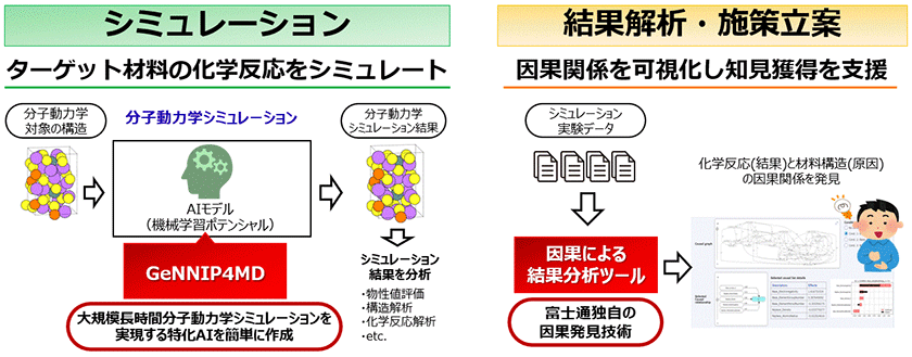 1つ目のツールは、材料の特性を予測する分子動力学シミュレーション向けのAI(機械学習ポテンシャル)を作成するツールです。分子動力学シミュレーションとは、原子に働く力を計算し原子のふるまいを再現し、材料の特性を高精度に予測する手法です。材料開発では、実際の材料に近い多数の原子で構成される材料のシミュレーションに高いニーズがあります。このツールは、数万〜数百万個の原子からなる材料を対象に、時間の経過による材料の変化を再現できる長時間のシミュレーションを行うためのAI を、簡単に作成することができます。学習に必要なデータセット自体を生成するため、事前に大量なデータを準備する必要はありません。また、AIに関する専門知識がなくても、簡単にデータを生成し学習させることができます。2つ目のツールは、因果による結果分析ツールです。大量のシミュレーションや実験結果を用いて、材料の構造と特性の間の複雑な因果関係(例えば、材料の構造という「原因」が、その化学反応や物性という「結果」にどのように影響しているか)を解析します。そして、富士通独自の因果発見技術(*1)により、特に重要な因果関係を抽出します。さらに、因果関係を可視化することで、どの構造がどの特性に影響しているのかが一目でわかるようになり、次にどのような材料を試作すべきかの判断を支援します。