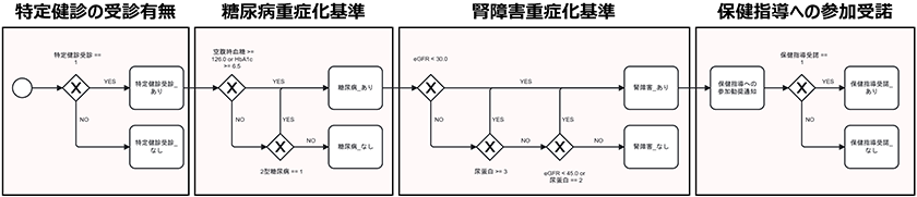 香村:まず、糖尿病性腎症重症化予防施策に関する自治体の施策文書をもとに、施策フローを作成しました。あわせて、他の自治体で実践されている同様の施策についても、施策フローを作成しました。そのうえで、こうして作成した多数の施策フローを構成要素レベルに分解し、再構成することで新たな施策候補を自動的に生成し、医療費や健康改善効果、勧奨通知の実施にかかるコストなどについてシミュレーションを行いました。その結果、保健指導を提供するための人的リソースなどの制約条件を満たしつつ、保健指導による医療費の抑制や健康指標の改善が期待できる施策候補を導出できることが確認できたのです。