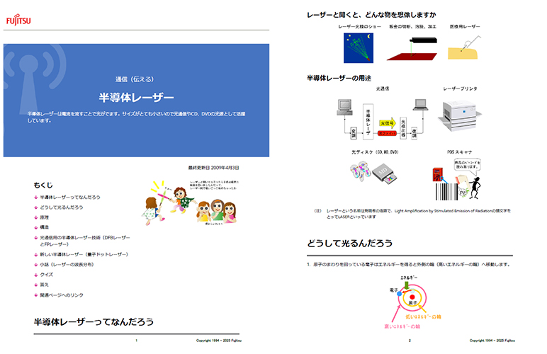 半導体レーザーは、電気を流すとピカッと光る、とっても小さな光の源です。これは、光を使った通信や、CDやDVDなどにはもうなくてはならない、とっても大切な技術なんです。この記事では、「半導体レーザーって、そもそもどんなものだろう?」という基本から、なぜ光るのかという「しくみ」や、その「作り」について、詳しくお話ししていきます。 2009年4月3日更新