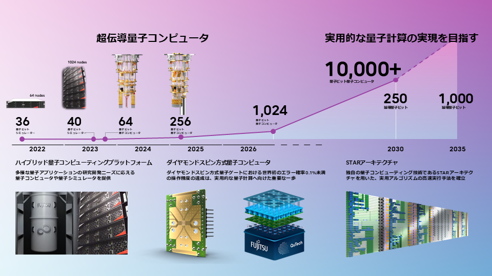 富士通は、2030年度を目途に1万物理量子ビット超の大規模超伝導量子コンピュータの構築を目指します。さらに、2030年度以降は超伝導・ダイヤモンドスピンの接続、2035年度には複数量子ビットチップのリモート接続も視野に入れ、1,000論理量子ビットの実現を目指します。富士通は量子コンピュータによる実用的な量子計算と産業化をあらゆる面で推進します。