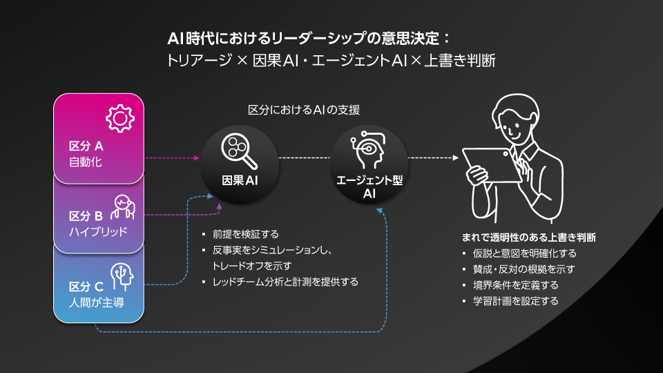 トリアージに当てはめると、区分Aの意思決定は引き続き自動化され、区分Bでは因果AIが仮説検証を繰り返し、トレードオフを明らかにすることでハイブリッドになります。区分CではAIが反事実的分析、レッドチーム分析、小規模テストのための計測を提供する一方、人間が主導権を握り続けます。