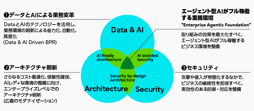 2つ目は「アーキテクチャの刷新」です。広義のモダナイゼーションと位置付けられます。今よりもさらにコスト最適化と俊敏性確保を進める。ビジネス環境とテクノロジー環境をともにAIレディに整える。エンタープライズレベルでアーキテクチャを刷新することが必要になります。