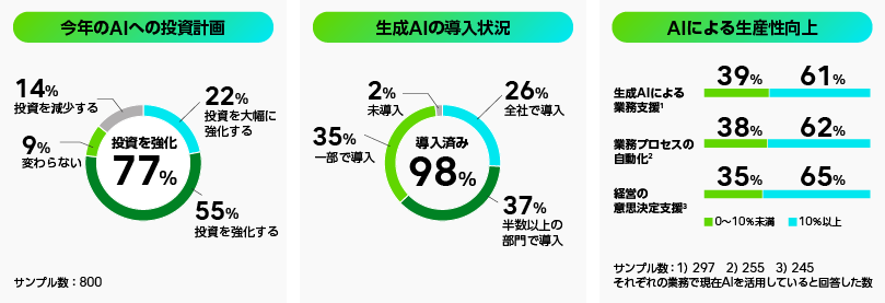 企業は生成AIをどれくらい導入し、効果を得ているのでしょう。富士通が2025年2月に15カ国・800人の経営幹部を対象とした調査「Fujitsu Technology and Service Vision 2025(*1)」によると、約8割の企業が「今年のAI投資を強化する」と回答。さらに生成AIについて、「全社で導入」「半数以上の部門で導入」「一部で導入」と回答した割合は計98%に上りました。さらに、AIを活用する企業の6割超が「AIによって従業員の生産性が10%以上向上した」と答えています(図表2)。