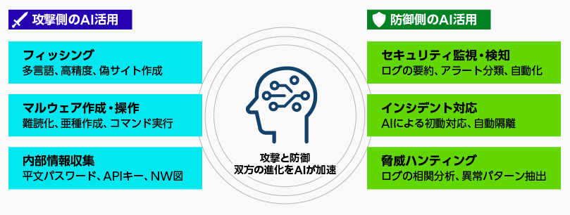 攻撃者が当たり前のようにAIを使う時代では、防御する私たちもAIで応戦する必要があります(図表4)。フィッシング、マルウェア作成や操作、内部情報の収集など、AIによる悪意のある攻撃はより広く、高精度に、狡猾になっています。侵入すると数百万のファイルの中からAIが自動検索し、すぐに目的のファイルのパスワードを見つけることも容易になっています。