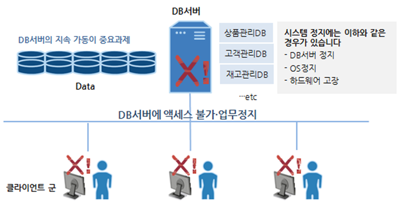 고객관리DB, 상품관리DB를 시스템 또는 DB자체 장애로 인해 사용할 수 없게 되면 판매,재고관리 및 전반적인 영업관리 업무의 중단을 초래 할 수 있습니다.
