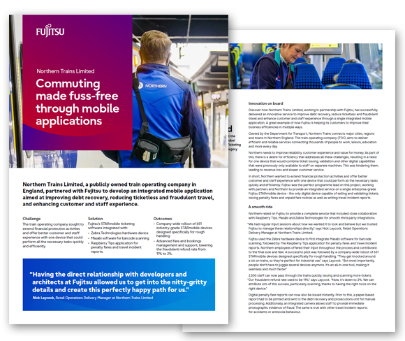 Northern Trains Limited, a publicly owned train operating company in England, partnered with Fujitsu to develop an integrated mobile application aimed at improving debt recovery, reducing ticketless and fraudulent travel, and enhancing customer and staff experience.