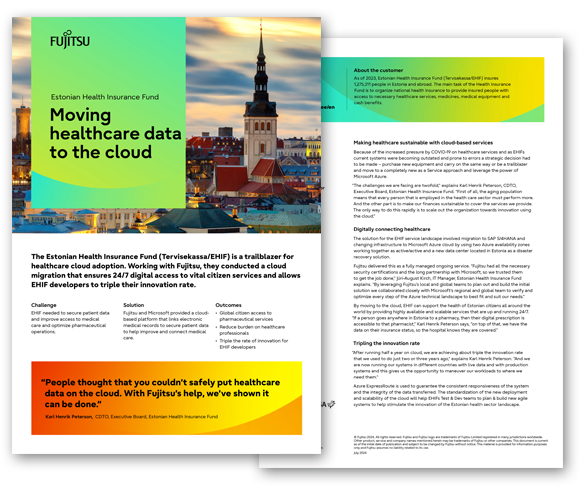 Fujitsu delivered this as a fully managed ongoing service. “Fujitsu had all the necessary security certifications and the long partnership with Microsoft, so we trusted them to get the job done,” Jüri-August Kirch, IT Manager, Estonian Health Insurance Fund explains. “By leveraging Fujitsu’s local and global teams to plan out and build the initial solution we collaborated closely with Microsoft’s regional and global team to verify and optimize every step of the Azure technical landscape to best fit and suit our needs.”