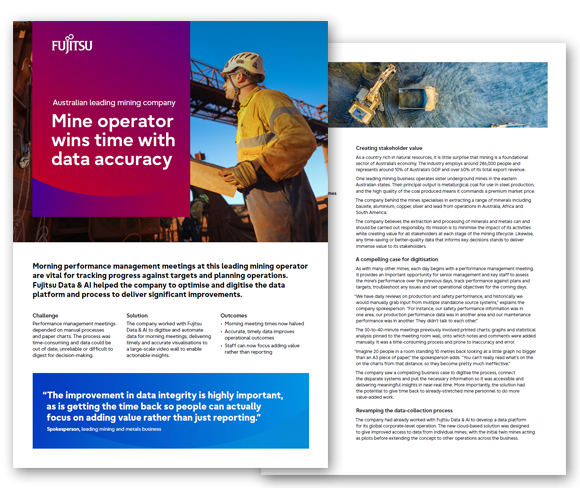 Morning performance management meetings at this leading mining operator are vital for tracking progress against targets and planning operations. Fujitsu Data & AI helped the company to optimise and digitise the data platform and process to deliver significant improvements.
