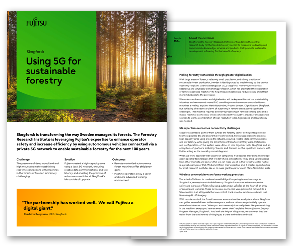 Skogforsk is transforming the way Sweden manages its forests. The Forestry Research Institute is leveraging Fujitsu’s expertise to enhance operator safety and increase efficiency by using autonomous vehicles connected via a private 5G network to enable sustainable forestry for the next 100 years.