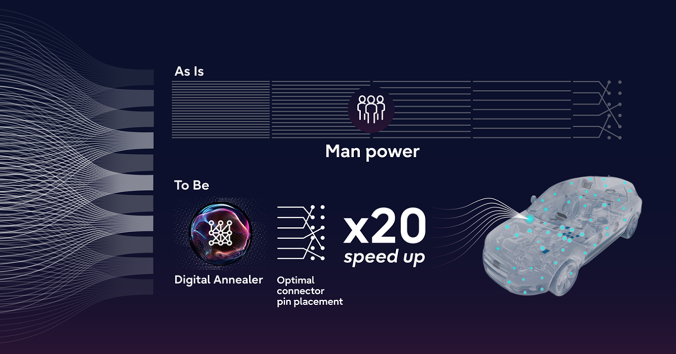 本專案透過蒐集並運用資深工程師過往的知識與經驗,將其所判定的連接器插針配置模式及其評估結果作為資料,訓練AI模型。隨後將該AI模型轉化為數學表達式,並透過數位退火技術進行高速運算,自動計算出最佳的插針配置方案。結果顯示,該流程的處理速度比傳統方法快了20倍以上。